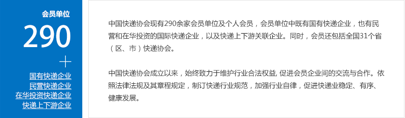 本會宗旨: 堅持實事求是、注重實效和民主協(xié)商的原則;維護會員單位合法權(quán)益,提供協(xié)會服務(wù);加強快遞企業(yè)之間、快遞企業(yè)與其他企業(yè)和組織間的交流與合作,提高快遞服務(wù)和企業(yè)內(nèi)部管理水平;規(guī)范會員企業(yè)行為,促進快遞行業(yè)自律,促進快遞市場穩(wěn)定、有序、健康發(fā)展;充分發(fā)揮全國性行業(yè)組織在政府和企業(yè)間的橋梁和紐帶作用。