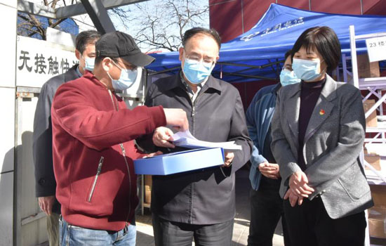 在朝陽(yáng)區(qū)西壩河南里社區(qū)設(shè)立的非直接接觸快遞存取點(diǎn),馬軍勝與社區(qū)干部親切交談,詢問(wèn)百姓取件存在的困難,瀏覽存取點(diǎn)的快件,翻看進(jìn)入社區(qū)投遞的快遞小哥承諾書。