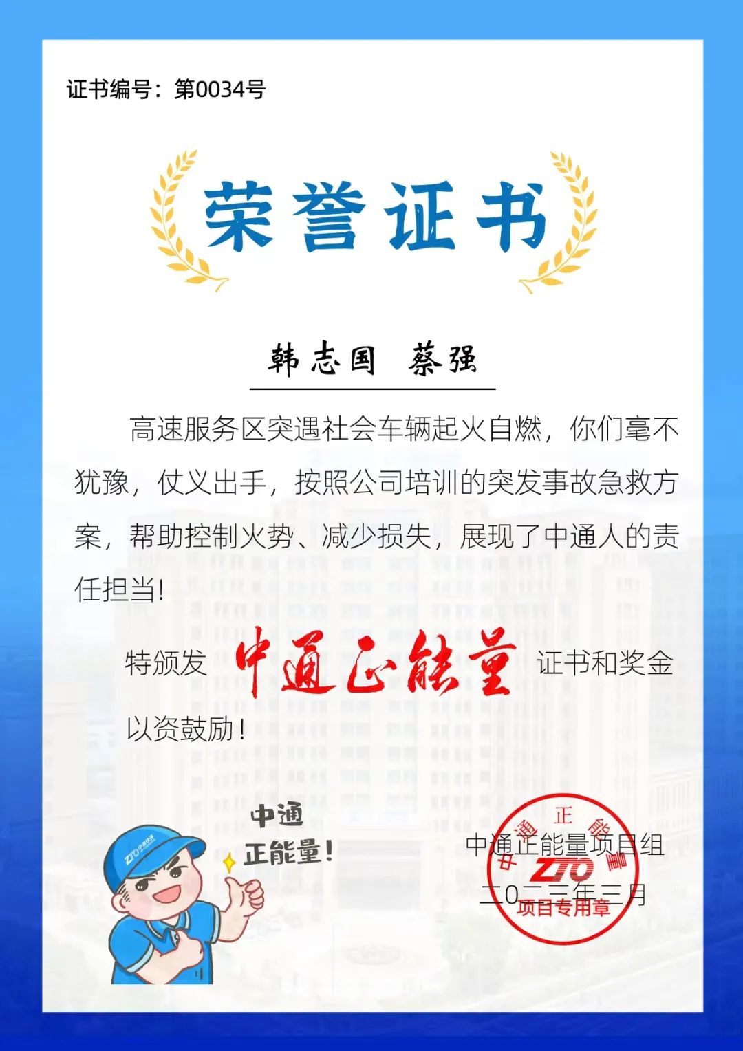 對于這種見義勇為的精神,中通一直大力褒獎和弘揚(yáng)。集團(tuán)正能量項(xiàng)目組在得知韓志國和蔡強(qiáng)的善舉后,依據(jù)《中通快遞集團(tuán)表彰獎勵管理辦法》,授予二人 “中通正能量”榮譽(yù)稱號,并分別獎勵500元現(xiàn)金。