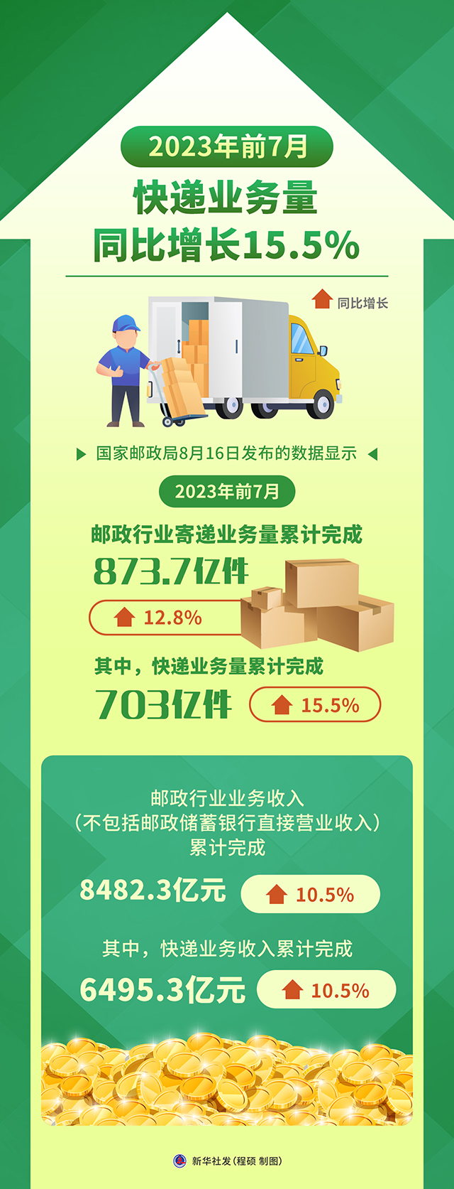 國家郵政局8月16日發(fā)布的數(shù)據(jù)顯示,2023年前7月,郵政行業(yè)寄遞業(yè)務量累計完成873.7億件,同比增長12.8%。其中,快遞業(yè)務量累計完成703億件,同比增長15.5%。