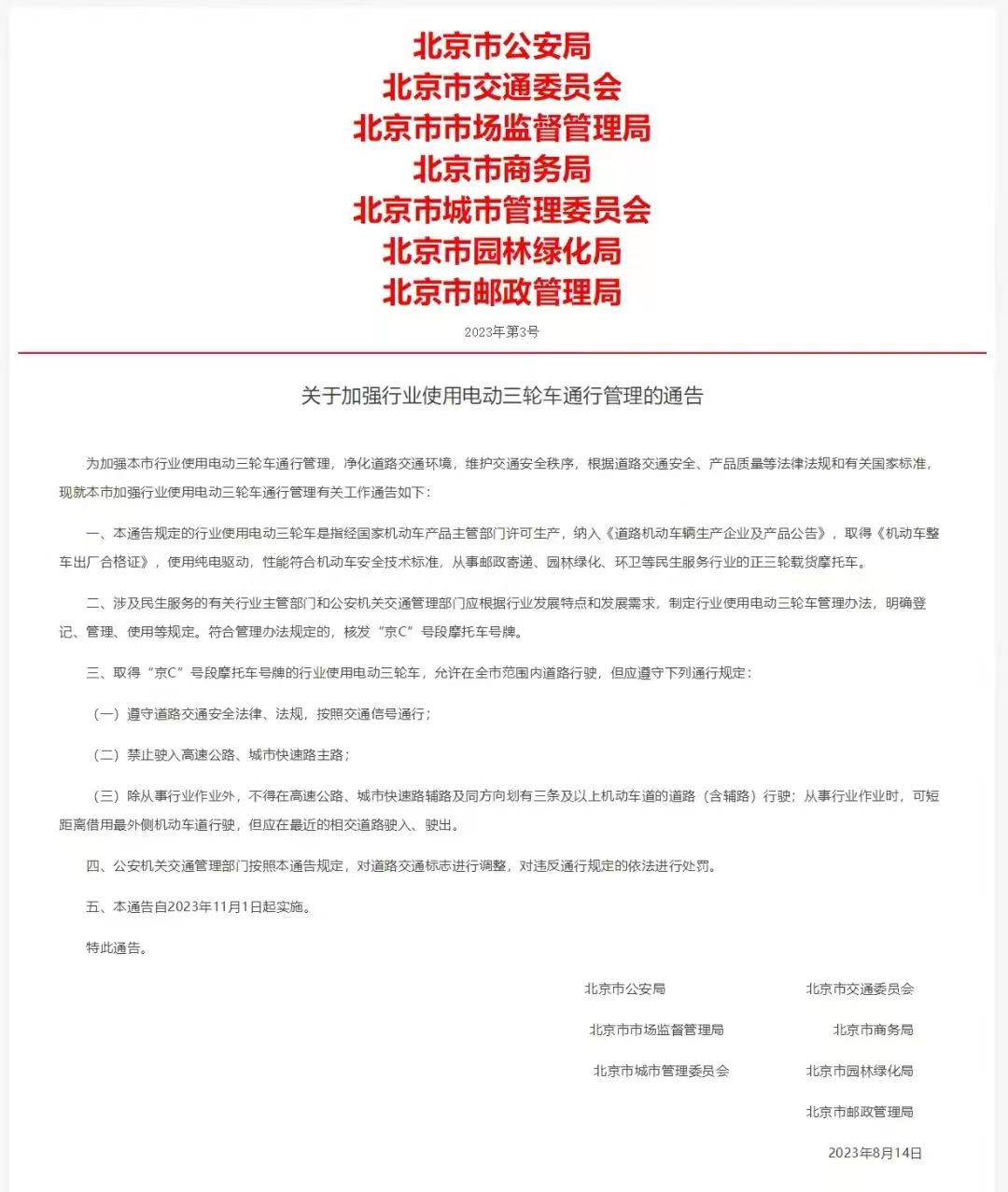 8月18日晚,北京市公安局、交通委、市場監(jiān)管局、商務(wù)局、城市管理委、園林綠化局、郵政管理局七部門聯(lián)合發(fā)布《關(guān)于加強(qiáng)行業(yè)使用電動(dòng)三輪車通行管理的通告》(以下簡稱《通告》),明確民生服務(wù)行業(yè)使用電動(dòng)三輪車的通行管理規(guī)定,將對郵政寄遞、園林綠化、環(huán)衛(wèi)等民生服務(wù)行業(yè)的車輛核發(fā)“京C”號段摩托車車牌,使用這些車輛的駕駛?cè)吮仨毧既∧ν熊囻{駛證,確保做到上路車輛“人持證、車上牌”。