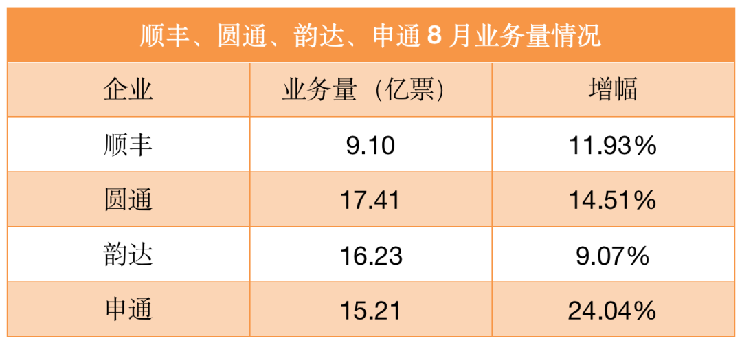 申通快遞8月快遞服務(wù)業(yè)務(wù)收入31.88億元,同比增長(zhǎng)7.63%;完成業(yè)務(wù)量15.21億票,同比增長(zhǎng)24.04%;快遞服務(wù)單票收入2.10元,同比下降13.22%。