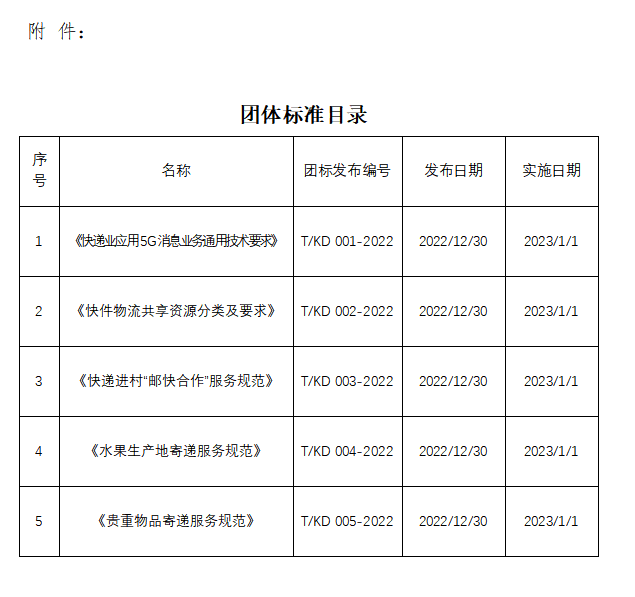 根據(jù)《中國快遞協(xié)會團(tuán)體標(biāo)準(zhǔn)管理辦法》的相關(guān)要求,《快遞業(yè)應(yīng)用5G消息業(yè)務(wù)通用技術(shù)要求》《快件物流共享資源分類及要求》《快遞進(jìn)村“郵快合作”服務(wù)規(guī)范》《水果生產(chǎn)地寄遞服務(wù)規(guī)范》《貴重物品寄遞服務(wù)規(guī)范》等五項(xiàng)團(tuán)體標(biāo)準(zhǔn)按照規(guī)定程序編制,經(jīng)常務(wù)理事會審議通過,現(xiàn)予以正式發(fā)布,自2023年1月1日起施行。