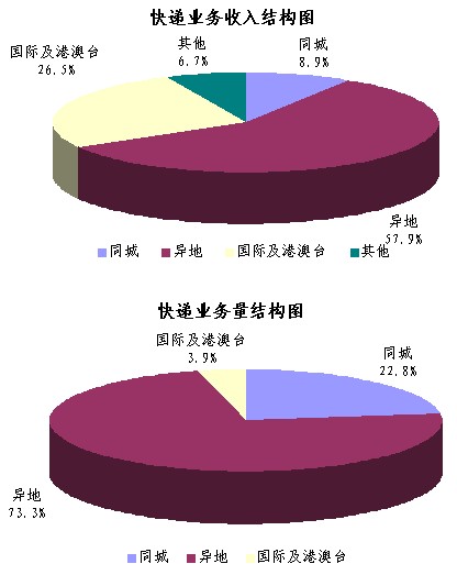 上半年,同城、異地、國際及港澳臺快遞業(yè)務(wù)收入分別占全部快遞收入的8.9%、57.9%和26.5%;業(yè)務(wù)量分別占全部快遞業(yè)務(wù)量的22.8%、73.3%和3.9%。與去年同期相比,同城快遞業(yè)務(wù)收入的比重上升2個百分點,異地快遞業(yè)務(wù)收入的比重上升3.6個百分點,國際及港澳臺業(yè)務(wù)收入的比重下降了5.5個百分點。