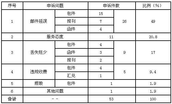 5月,受理消費者關于郵政服務問題的有效申訴53件,比上月減少44件,下降45.4%。其中,反映郵件延誤的26件,占49%;反映服務態(tài)度差的11件,占20.8%;反映郵件丟失及內件短少的9件,占17%;反映違規(guī)收費的5件,占9.4%;反映郵件損毀的1件,占1.9%;反映其他問題的1件,占1.9%。