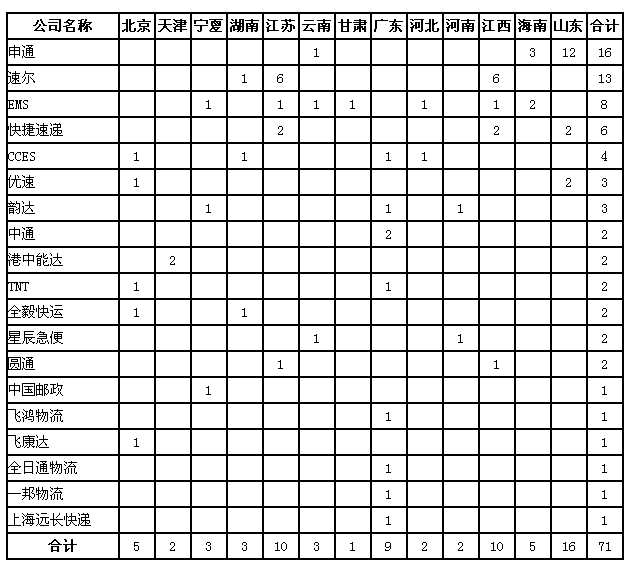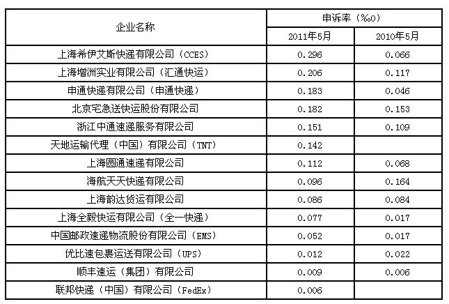 5月,消費者對38家快遞企業(yè)進行了有效申訴,全國快遞業(yè)務平均有效申訴率為萬分之零點零八六(0.086‰0)。