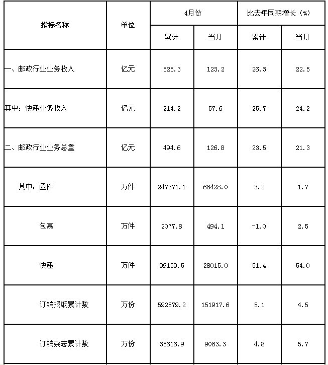 1-4月,郵政函件業(yè)務(wù)累計(jì)完成24.7億件,同比增長3.2%;包裹業(yè)務(wù)累計(jì)完成2077.8萬件,同比下降1%;報(bào)紙業(yè)務(wù)累計(jì)完成59.3億份,同比增長5.1%;雜志業(yè)務(wù)累計(jì)完成3.6億份,同比增長4.8%;匯兌業(yè)務(wù)累計(jì)完成8293.3萬筆,同比下降1.8%。