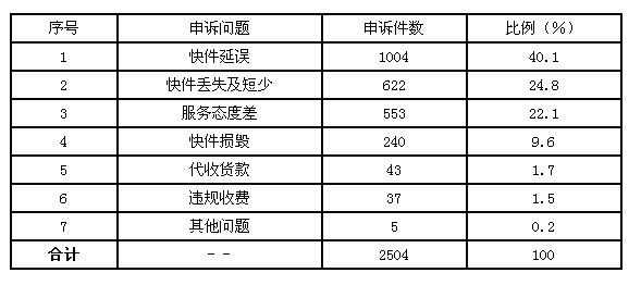4月,受理消費者關(guān)于快遞業(yè)務(wù)的有效申訴2504件。比上月減少1627件,下降39.4%。其中,反映快件延誤的1004件,占40.1%;反映快件丟失及內(nèi)件短少的622件,占24.8%;反映服務(wù)態(tài)度差的553件,占22.1%;反映快件損毀的240件,占9.6%;反映代收貨款問題的43件,占1.7%;反映違規(guī)收費的37件,占1.5%;反映其他問題的5件,占0.2%。