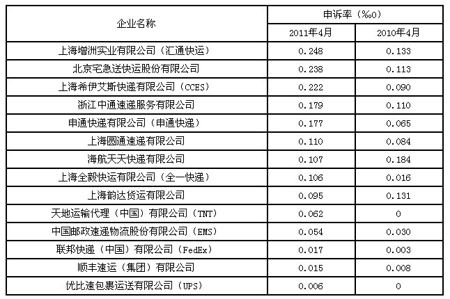 4月,消費者對31家快遞企業(yè)進行了有效申訴,全國快遞業(yè)務(wù)平均有效申訴率為萬分之零點零九二(0.092‰0)。