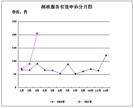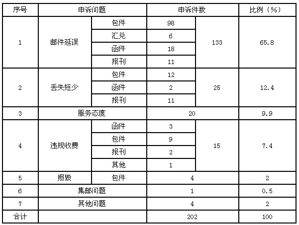 3月,受理消費者關(guān)于郵政服務(wù)問題的有效申訴202件,同比增加112件,增長124.4%。比上月增加113件,增長127%。其中,反映郵件延誤的133件,占65.8%;反映郵件丟失及內(nèi)件短少的25件,占12.4%;反映服務(wù)態(tài)度差的20件,占9.9%;反映違規(guī)收費的15件,占7.4%;反映郵件損毀的4件,占2%;反映集郵問題的1件,占0.5%;反映其他問題的4件,占2%。