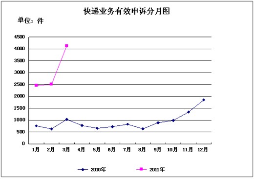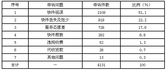 3月,受理消費者關(guān)于快遞業(yè)務(wù)的有效申訴4131件,同比增加3098件,增長299.9%。比上月增加1625件,增長64.8%。其中,反映快件延誤的2109件,占51.1%;反映快件丟失及內(nèi)件短少的919件,占22.2%;反映服務(wù)態(tài)度差的728件,占17.6%;反映快件損毀的282件,占6.8%;反映違規(guī)收費的52件,占1.3%;反映代收貨款問題的28件,占0.7%;反映其他問題的13件,占0.3%。