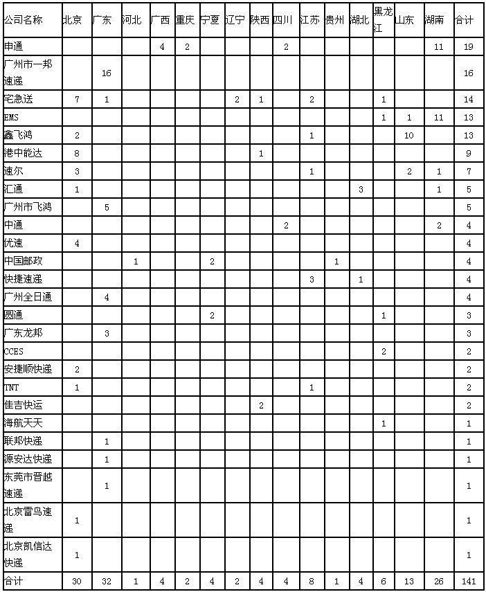 3月,快遞企業(yè)對省郵政管理局轉(zhuǎn)辦的申訴未能按規(guī)定時限回復(fù)的有141件,其中:申通快遞19件、廣州市一邦速遞16件、北京宅急送快運14件、中國郵政速遞物流公司(EMS)13件、鑫飛鴻快遞13件。