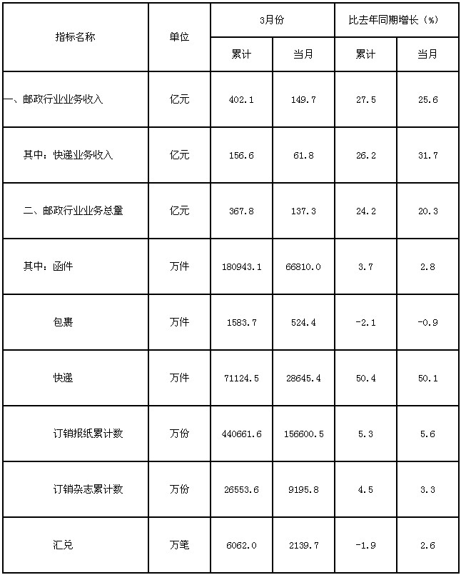 一季度,郵政函件業(yè)務(wù)累計完成18.1億件,同比增長3.7%;報紙業(yè)務(wù)累計完成44.1億份,同比增長5.3%;雜志業(yè)務(wù)累計完成2.7億份,同比增長4.5%;匯兌業(yè)務(wù)累計完成6062萬筆,同比下降1.9%。