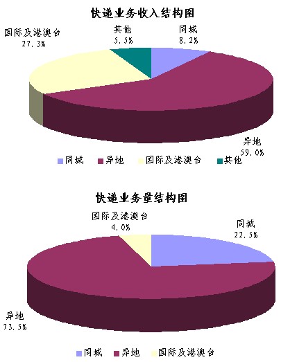 全國規(guī)模以上快遞服務(wù)企業(yè)業(yè)務(wù)量累計完成4.2億件,同比增長50.6%;業(yè)務(wù)收入累計完成94.7億元,同比增長22.9%。其中,同城業(yè)務(wù)收入累計完成7.7億元,同比增長55.3%;異地業(yè)務(wù)收入累計完成55.9億元,同比增長32.6%;國際及港澳臺業(yè)務(wù)收入累計完成25.8億元,同比增長2.5%。