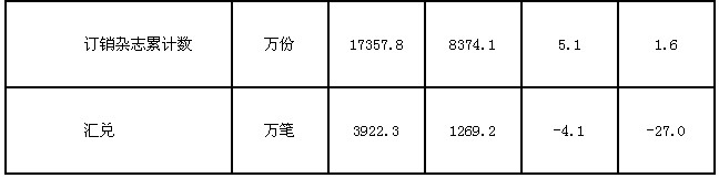 郵政函件業(yè)務(wù)累計完成11.4億件,同比增長4.3%;報紙業(yè)務(wù)累計完成28.4億份,同比增長5.2%;雜志業(yè)務(wù)累計完成1.7億份,同比增長5.1%;匯兌業(yè)務(wù)累計完成3922.3萬筆,同比下降4.1%。