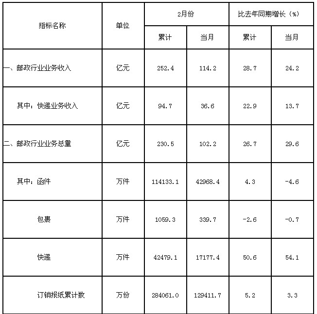 國家郵政局:1至2月郵政行業(yè)業(yè)務(wù)收入同比增長28.7%