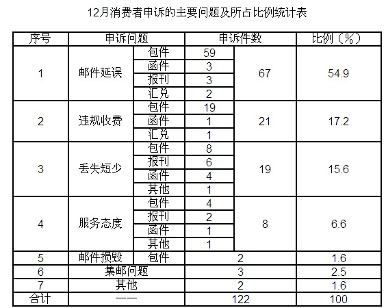 12月,受理消費(fèi)者關(guān)于郵政服務(wù)問(wèn)題的有效申訴122件,比上月增加58件,增長(zhǎng)90.6%。比上年同期增加36件,增長(zhǎng)41.9%。其中,反映郵件延誤的67件,占54.9%;反映違規(guī)收費(fèi)的21件,占17.2%;反映郵件丟失及內(nèi)件短少的19件,占15.6%;反映服務(wù)態(tài)度差的8件,占6.6%;反映集郵問(wèn)題的3件,占2.5%;反映郵件損毀問(wèn)題的2件,占1.6%。反映其他問(wèn)題的2件,占1.6%。