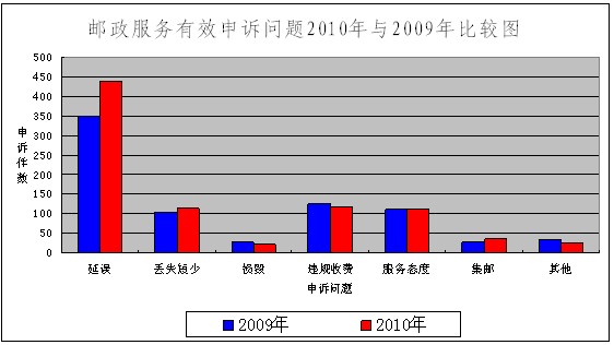 2010年共受理關(guān)于郵政服務(wù)的有效申訴863件,占全年有效申訴量的7.2%,比2009年增加87件,增長(zhǎng)11.2%。