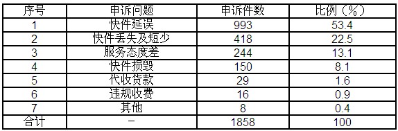 12月消費(fèi)者對(duì)快遞業(yè)務(wù)申訴的主要問(wèn)題是快件延誤、丟失及內(nèi)件短少、服務(wù)態(tài)度差,占快遞業(yè)務(wù)有效申訴量的89%。上述三項(xiàng)問(wèn)題的有效申訴量分別比上月增長(zhǎng)34.4%、40.7%和98.4%。