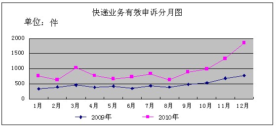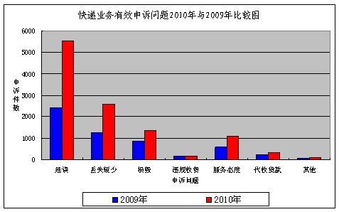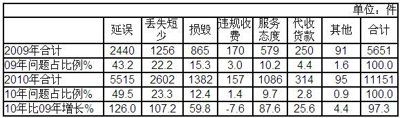 2010年共受理關(guān)于快遞業(yè)務(wù)的有效申訴11151件,占全年有效申訴量的92.8%,與2009年相比同比增加5500件,增長(zhǎng)97.3%。