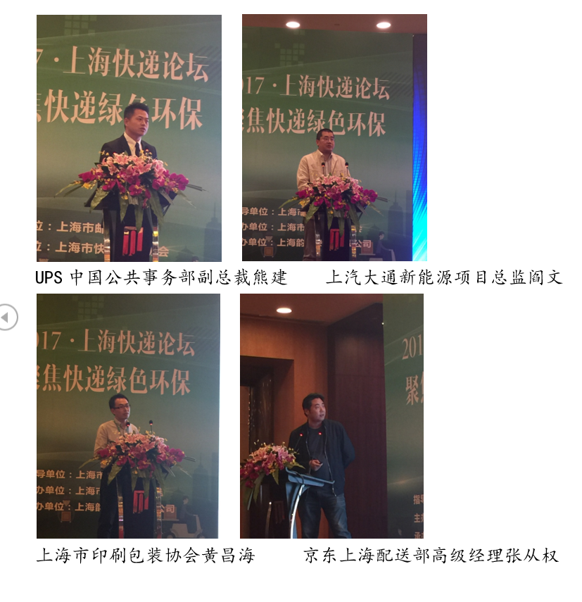 在嘉賓主旨演講階段,UPS中國(guó)公共事務(wù)部副總裁熊建,上汽大通新能源項(xiàng)目總監(jiān)閻文,上海市印刷包裝協(xié)會(huì)《上海印刷》雜志主編黃昌海,京東物流上海配送部高級(jí)經(jīng)理張從權(quán),正信光電科技股份公司副總經(jīng)理魏承剛等五位嘉賓分別介紹了本單位在開(kāi)展快遞綠色環(huán)保工作方面的取得的經(jīng)驗(yàn)、開(kāi)發(fā)的高能效運(yùn)載裝備、可降解包裝箱研制、包裝材料回收利用、生產(chǎn)場(chǎng)地發(fā)電新設(shè)備使用價(jià)值等方面作了精彩演講。