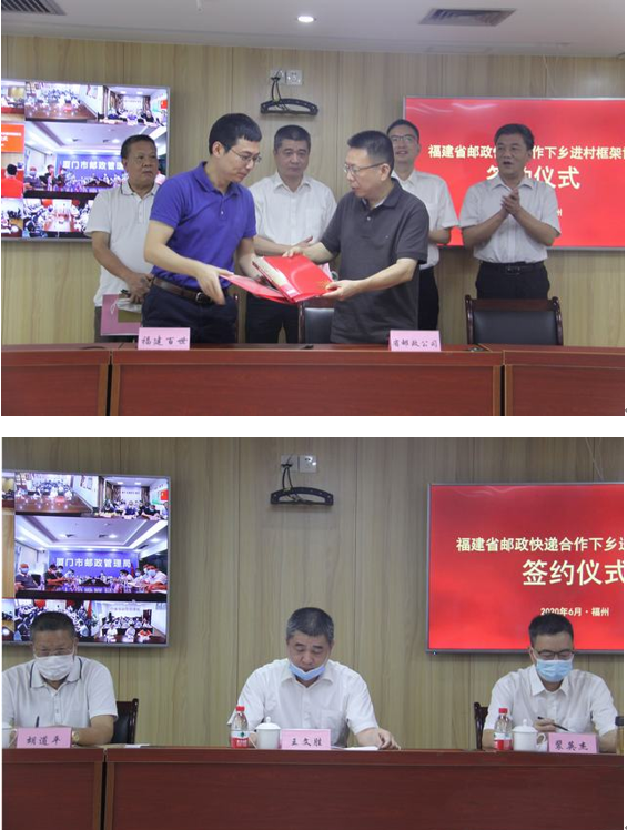 為貫徹落實習(xí)近平總書記重要指示精神和國家郵政局黨組決策部署,充分發(fā)揮郵政基礎(chǔ)網(wǎng)絡(luò)價值,暢通工業(yè)品下鄉(xiāng)、農(nóng)產(chǎn)品進(jìn)城“毛細(xì)血管”,更好助力精準(zhǔn)扶貧和鄉(xiāng)村振興戰(zhàn)略實施,6月19日,福建局組織召開全省郵政快遞合作下鄉(xiāng)進(jìn)村框架協(xié)議簽約儀式暨郵快合作工作部署電視電話會議,中國郵政集團(tuán)有限公司福建省分公司分別與順豐、京東、蘇寧、德邦、申通、中通、圓通、韻達(dá)、百世等9家主要品牌快遞企業(yè)福建區(qū)部簽署了合作下鄉(xiāng)進(jìn)村框架協(xié)議,約定將以郵政普遍服務(wù)網(wǎng)絡(luò)為基礎(chǔ),以推進(jìn)農(nóng)村地區(qū)郵政服務(wù)與快遞服務(wù)協(xié)同發(fā)展為合作內(nèi)容,共同拓展農(nóng)村郵政快遞市場,服務(wù)農(nóng)村電商發(fā)展。福建局黨組成員、副局長(主持工作)王文勝,省快遞行業(yè)協(xié)會會長胡道平,中國郵政集團(tuán)有限公司福建省分公司總經(jīng)理裴英杰以及各主要品牌快遞企業(yè)福建區(qū)部負(fù)責(zé)人出席并見證簽約儀式。各設(shè)區(qū)市郵政管理局局領(lǐng)導(dǎo)及部門負(fù)責(zé)人,快遞行業(yè)協(xié)會會長,全省首批參與郵快合作的11個縣域郵政監(jiān)管派駐機(jī)構(gòu)和郵政企業(yè)負(fù)責(zé)人,郵快合作各方在當(dāng)?shù)刂睜I或加盟企業(yè)負(fù)責(zé)人以電視電話會議形式在各地分會場參加了簽約儀式。