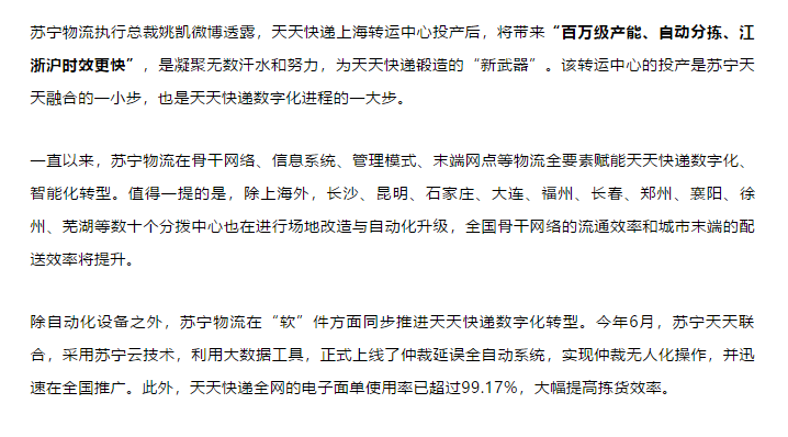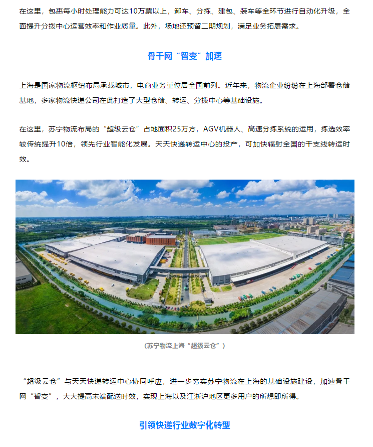 骨干網(wǎng)“智變”!天天快遞上海智能化轉(zhuǎn)運(yùn)中心正式投產(chǎn)