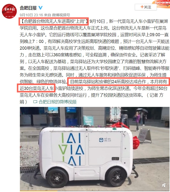 合肥高校啟用首臺菜鳥無人物流車“小蠻驢”