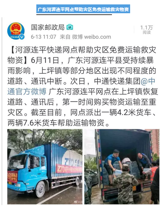 近日,廣東河源連平縣受持續(xù)暴雨影響,部分地區(qū)出現(xiàn)不同程度道路、通訊中斷。6月12日,廣東河源連平網(wǎng)點(diǎn)第一時(shí)間購(gòu)買物資運(yùn)輸至重災(zāi)區(qū),并協(xié)助當(dāng)?shù)匕l(fā)改局、商會(huì)及民間組織免費(fèi)運(yùn)輸各類生活用品及藥品等救災(zāi)物資。