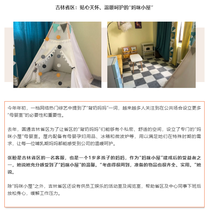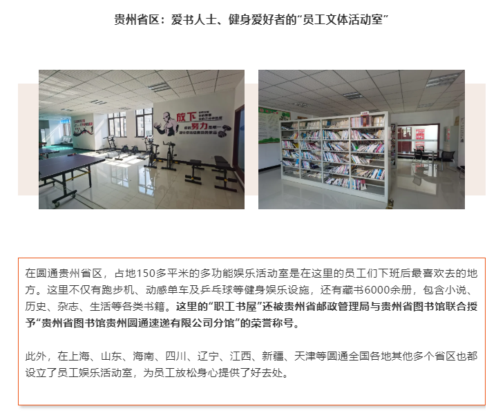 人是企業(yè)最寶貴的資源。如今,在圓通總部及全國各地省區(qū),上百平米的員工活動室、貼心人性化的母嬰室、藏書千余本的職工閱覽室、配備齊全的健身娛樂室,一應(yīng)俱全,面面俱到……圓通始終堅持以人為本,持續(xù)創(chuàng)新、豐富形式,關(guān)心、關(guān)懷快遞小哥等在內(nèi)的快遞一線員工。