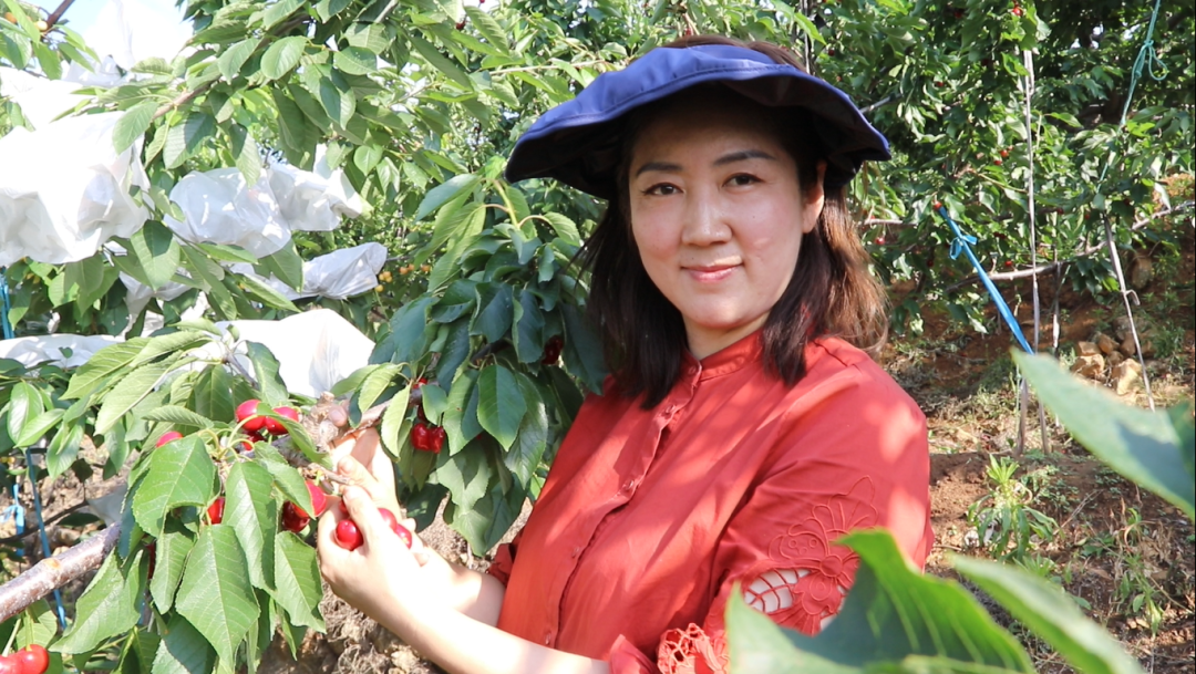 煙臺源濃果樹合作社負責(zé)人張曉莉正在果園中進行櫻桃采摘