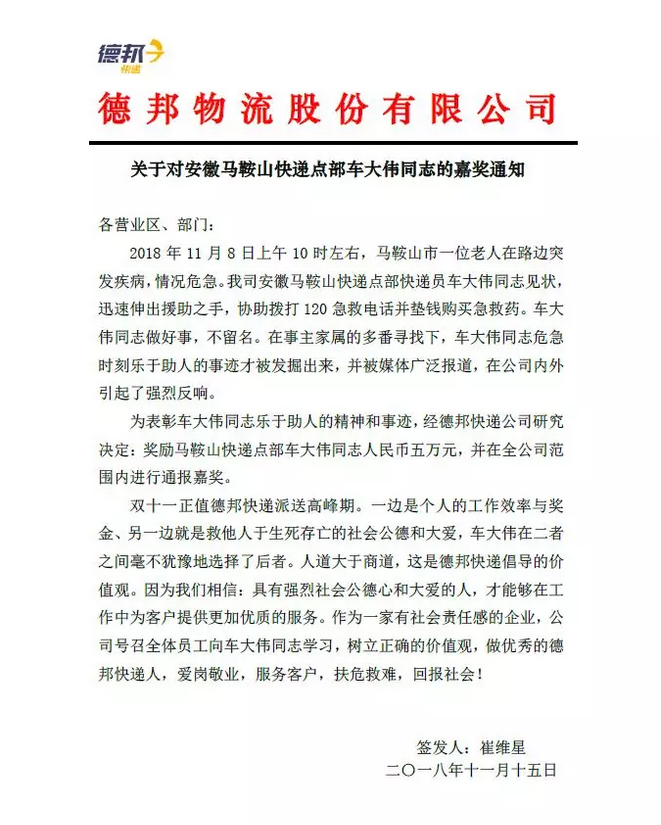 15日,崔維星簽發(fā)嘉獎(jiǎng)通知,通知中寫道——“雙11”正值快遞高峰期,一邊是個(gè)人的工作效率與獎(jiǎng)金,另一邊是救他人于生死存亡的社會(huì)公德和大愛,車大偉在兩者間毫不猶豫地選擇了后者。人道大于商道,這是德邦快遞倡導(dǎo)的價(jià)值觀。