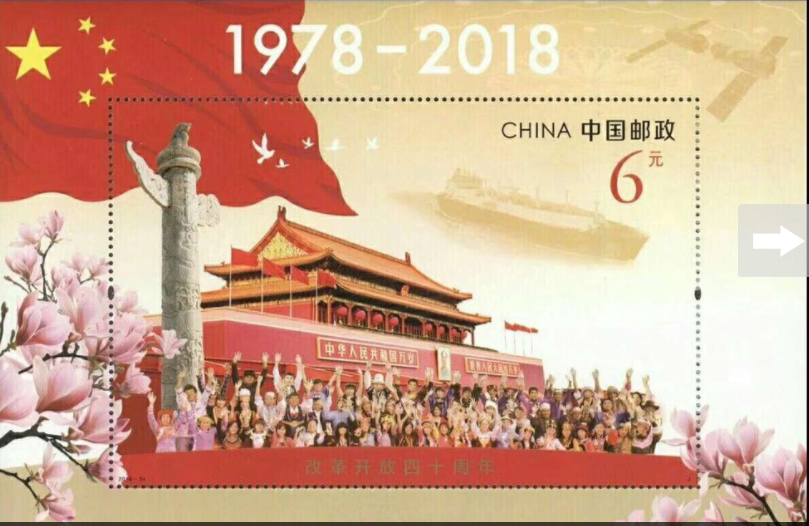 中國郵政2018年12月18日發(fā)行《改革開放四十周年》紀念郵票1套2枚,小型張1枚。郵票圖案名稱分別為高舉旗幟、偉大實踐,小型張圖案名稱為筑夢新時代,全套郵票面值8.40元。