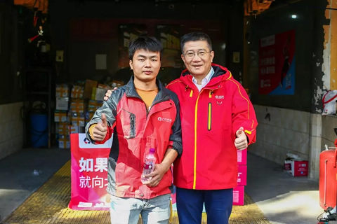 (圖:百世集團(tuán)董事長兼CEO周韶寧向快遞員滕文兵發(fā)放蘇打水)